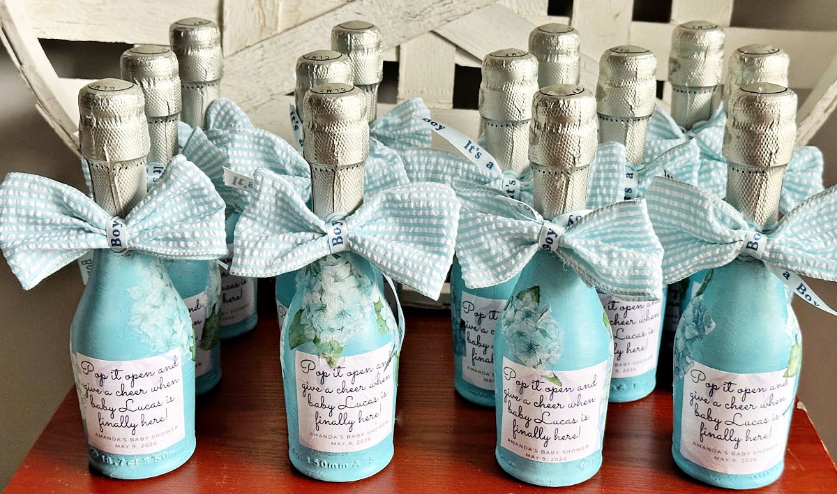 These DIY baby shower favors, made with mini champagne bottles, are a fun and easy way to create favors that feel personal and thoughtful without a lot of effort.