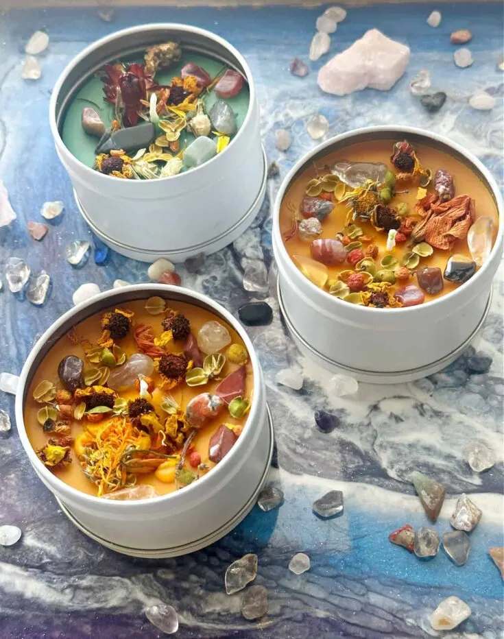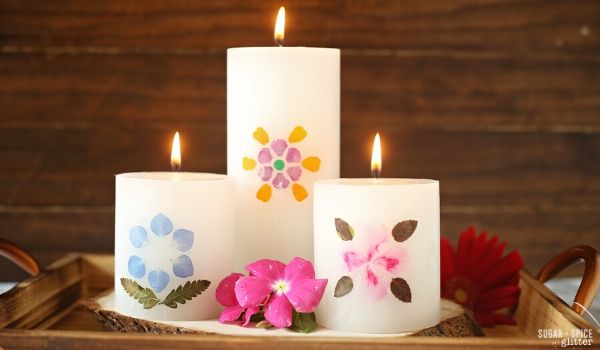 Using essential oils, dried flowers, and your preferred crystals, you can craft beautiful candles featuring pressed flowers.