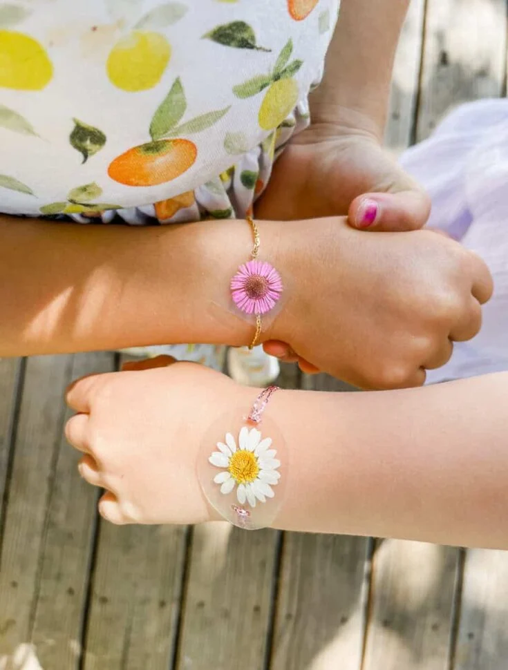 Creating bracelets with pressed flowers is a fun project and a great nature-inspired craft for kids! You can either gather your own fresh flowers or utilize dried ones from a craft store.