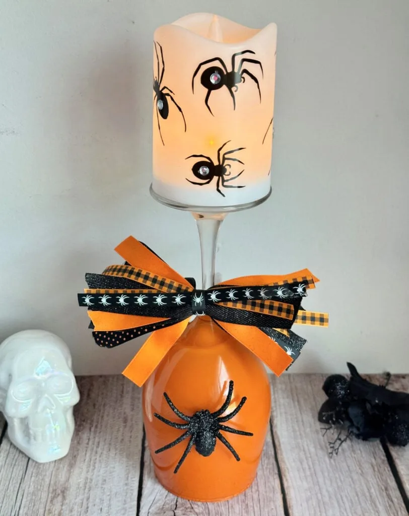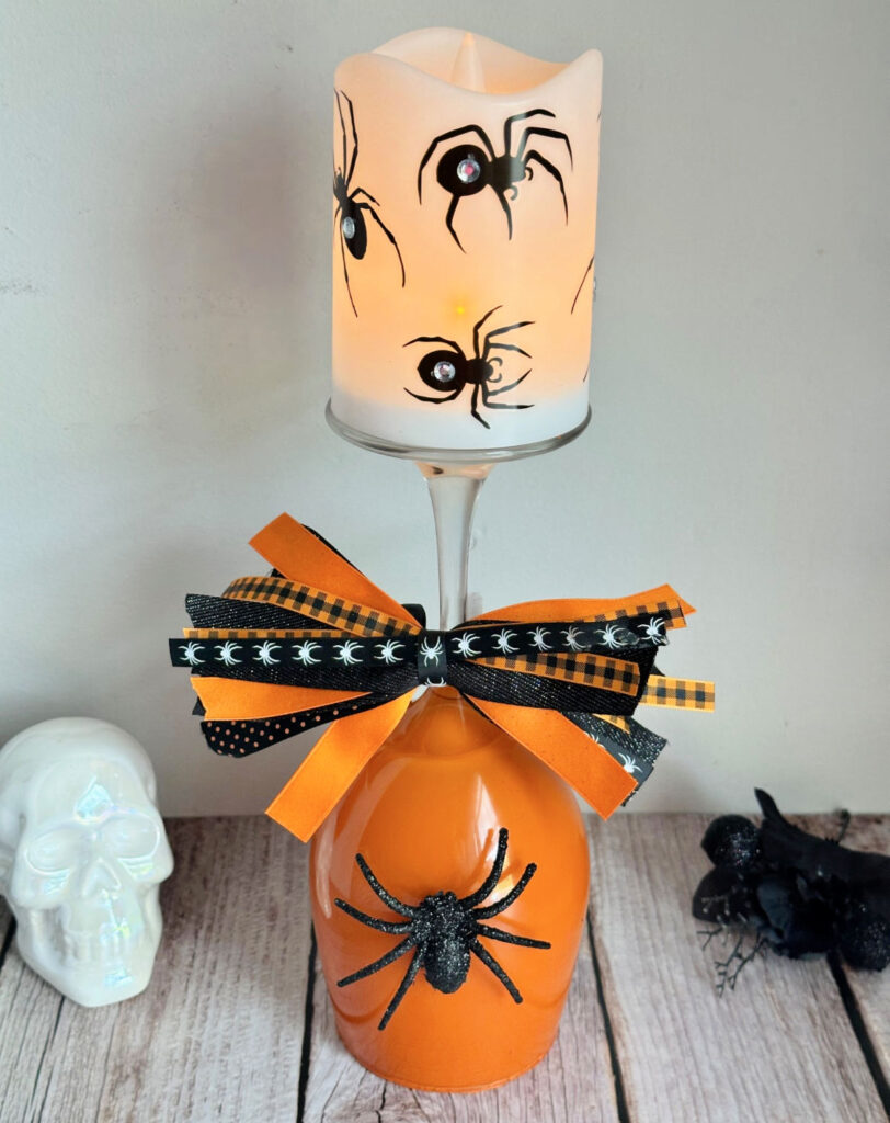 Dollar Tree pumpkin wine glass candle holders that easily switch from fall decor to spooky Halloween style. One craft, two seasonal looks!