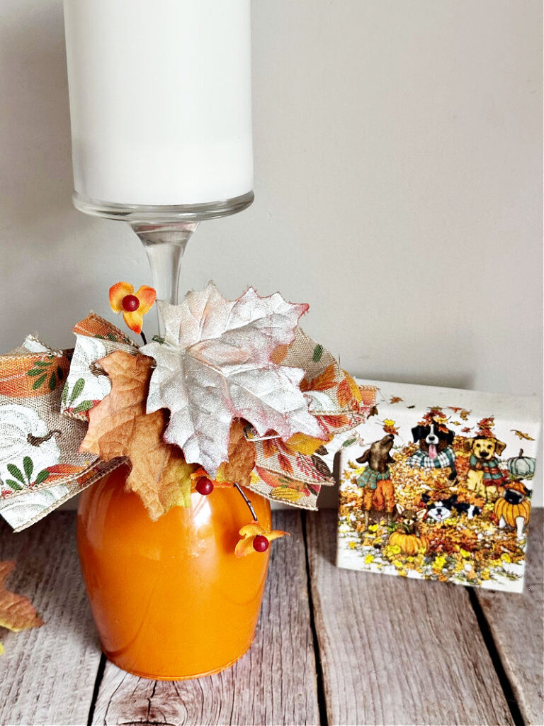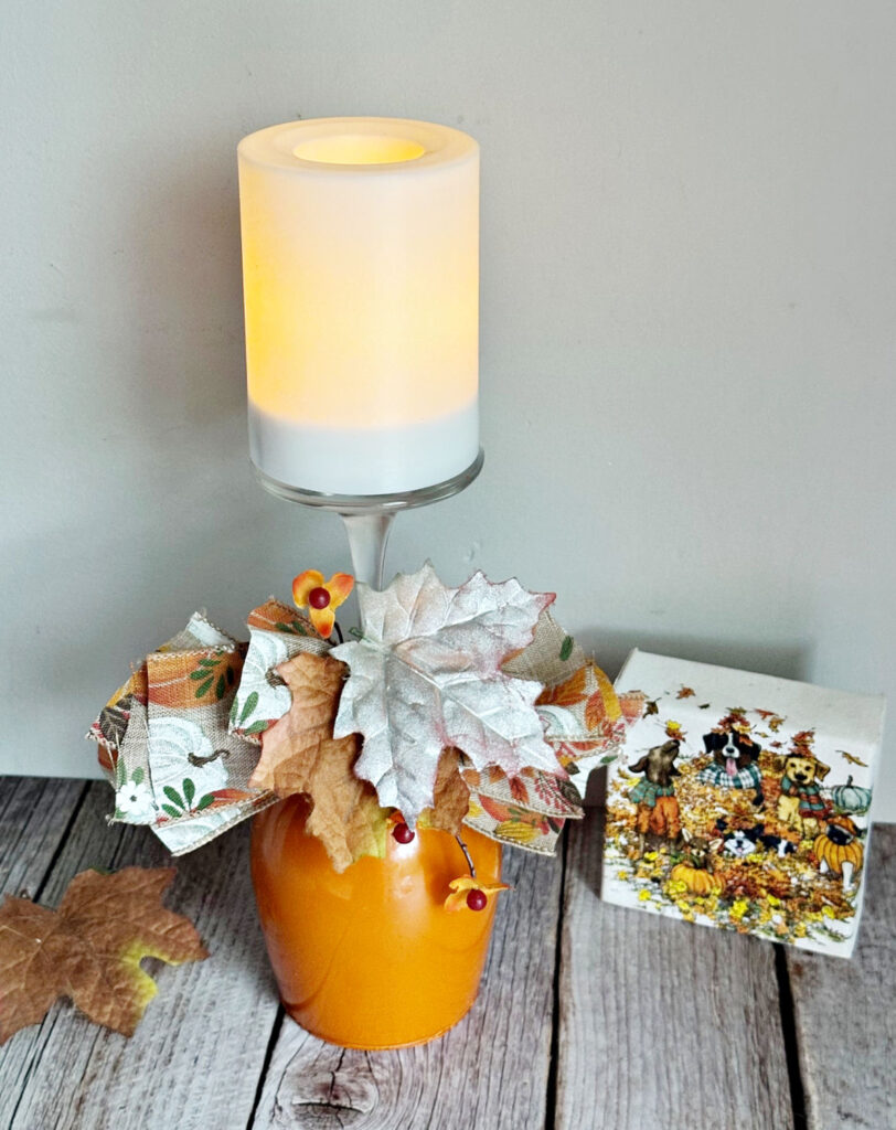 Now for the fun part! Add pretty flowers, fall leaves and ribbon for a fall wine glass candle holder.