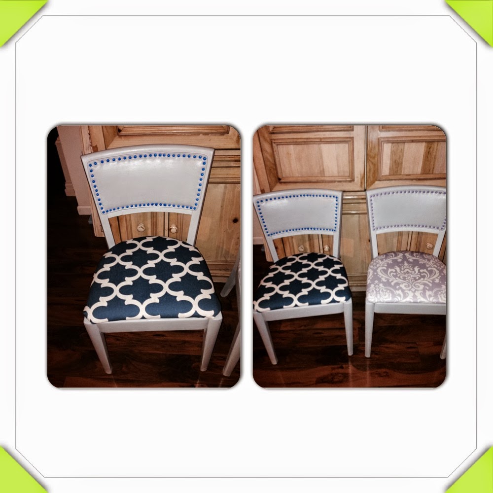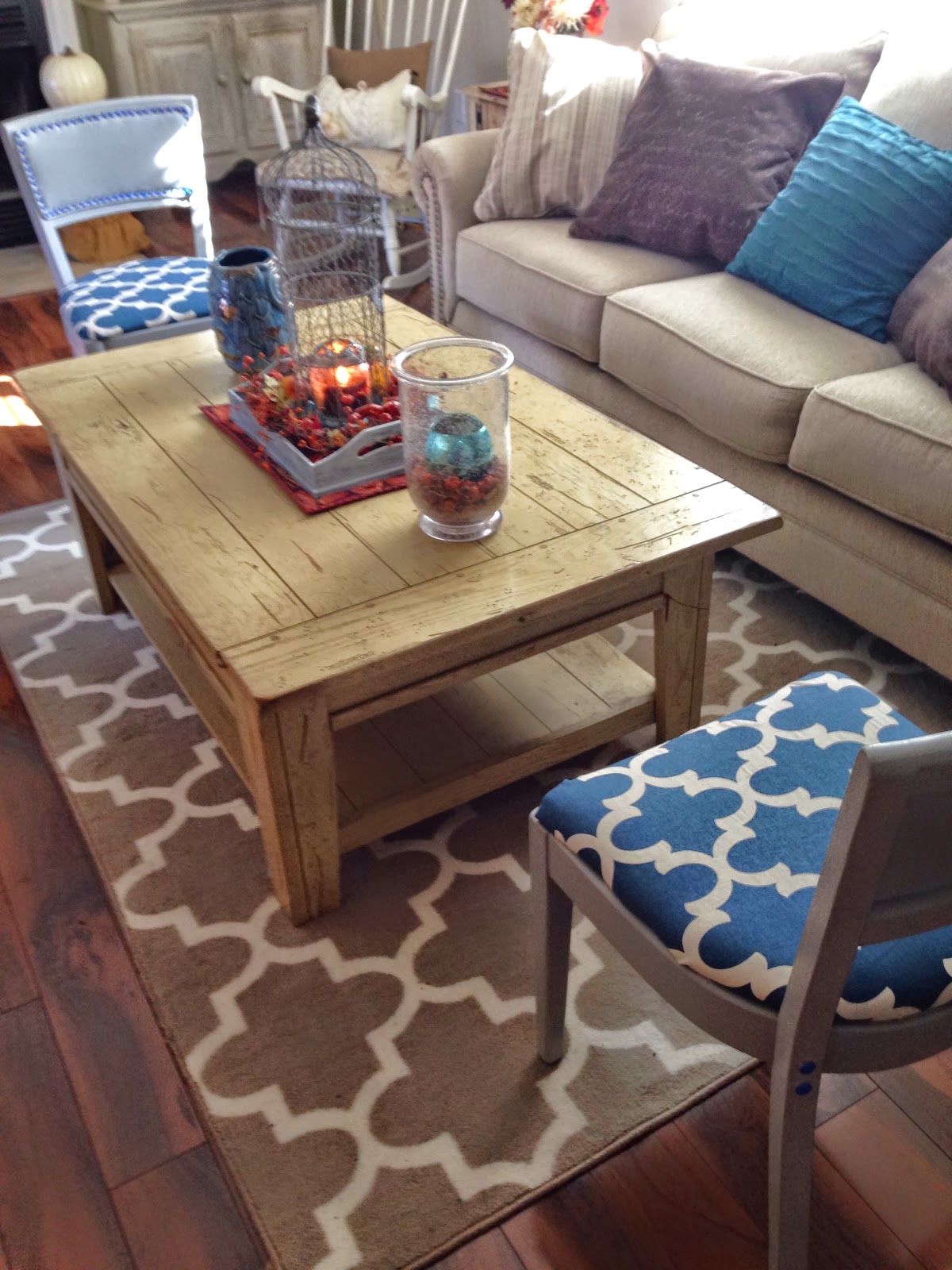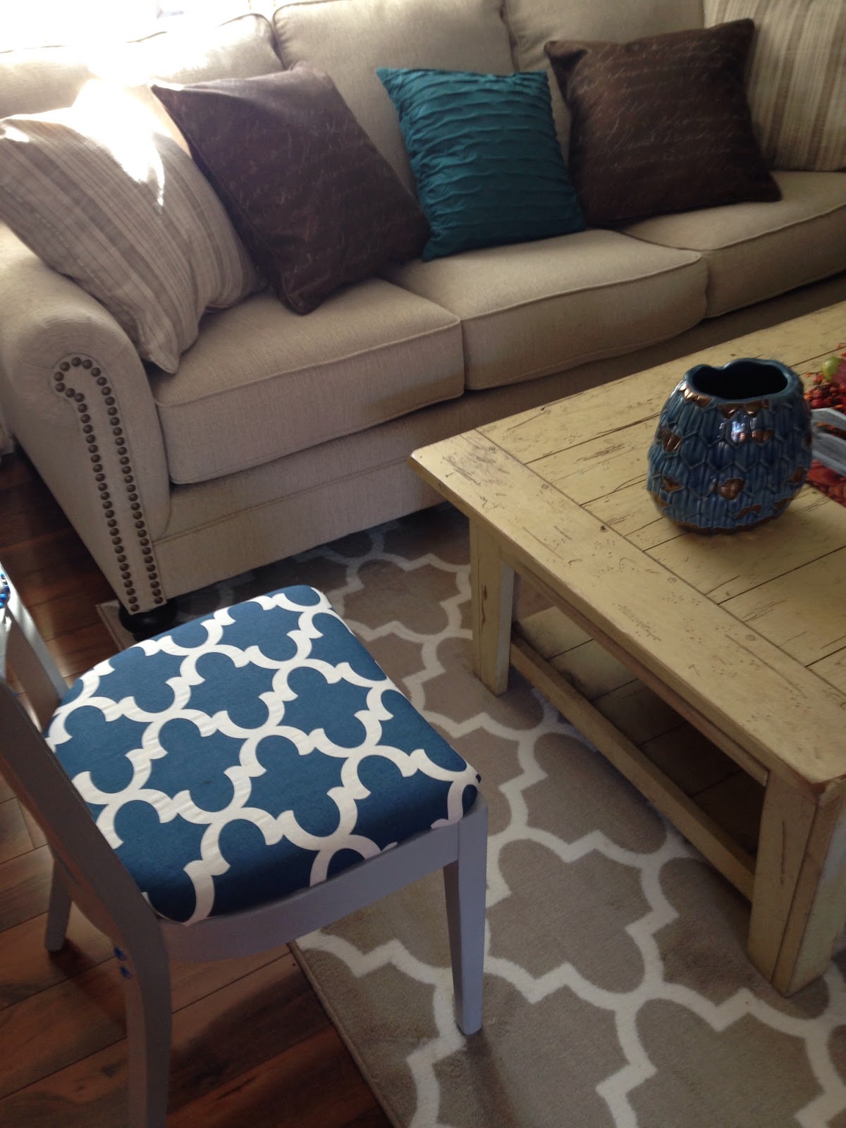 I went to Joanne Fabrics & bought a yard of fabric in the same pattern as my new rug from Target, but in a nice shade of blue. With a yard of fabric I was able to cover both chairs & make a lampshade also.