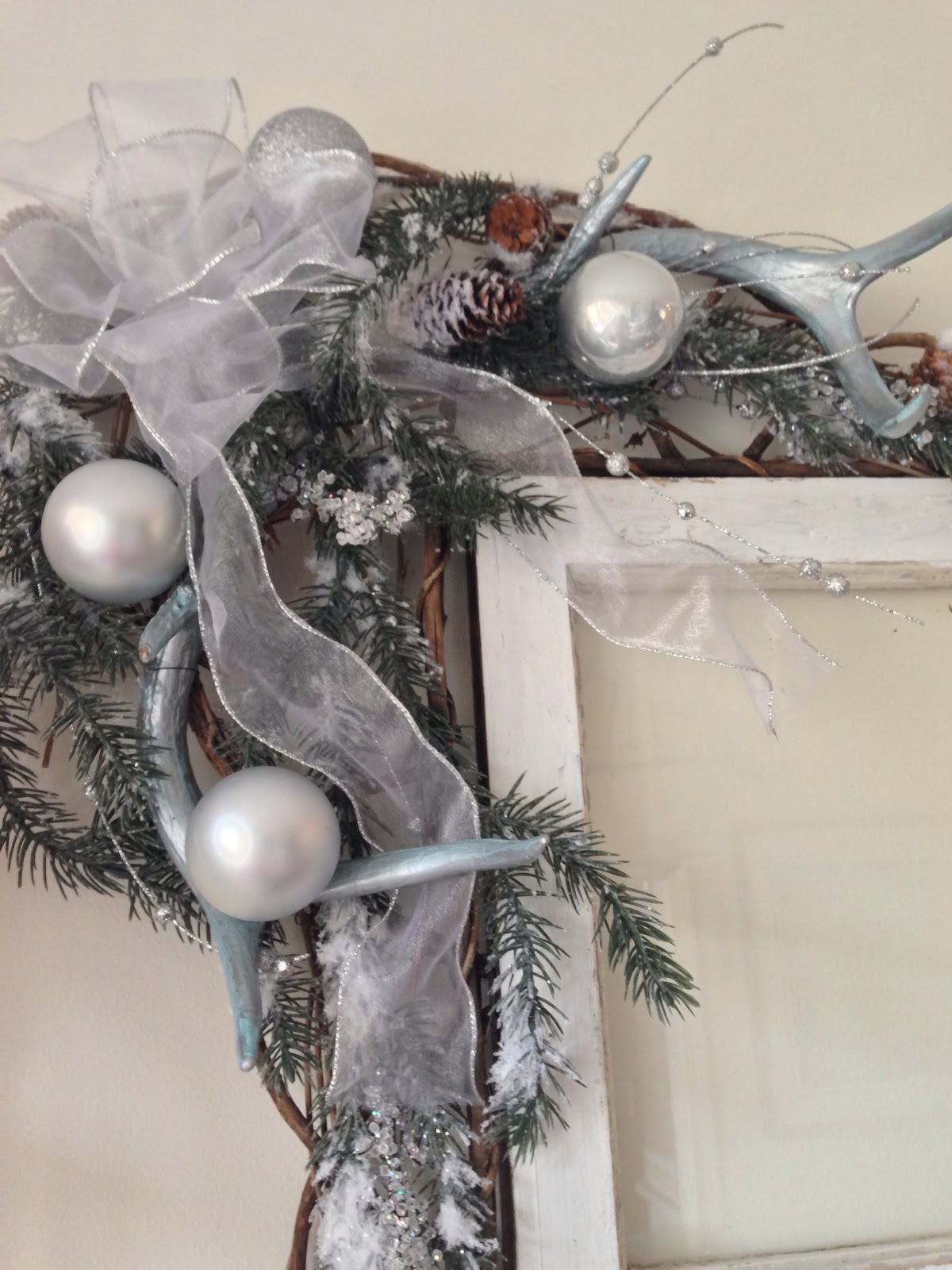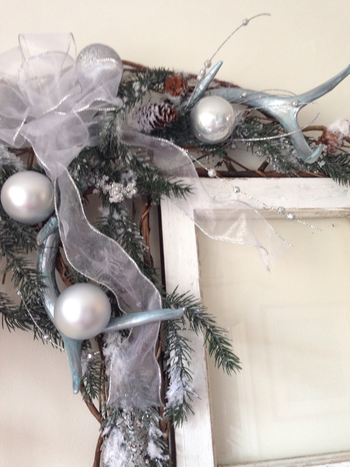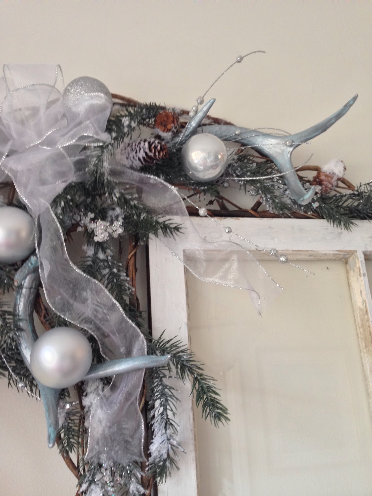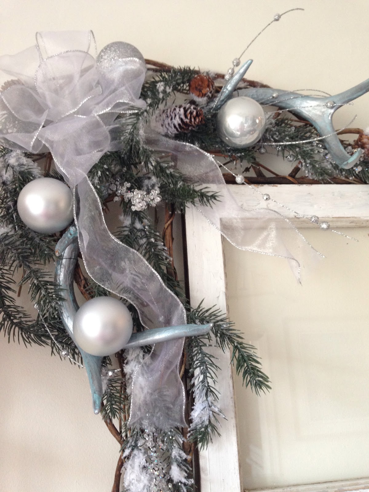 I have been busy working on Christmas projects to go with my silver theme this year. I wanted to make a corner swag to hang on the old window I hung in the dining room. I had a grapevine base and attached pine & some pretty silver stems along with antler sheds that I painted silver & topped it off with a large bow. It came together in no time!
