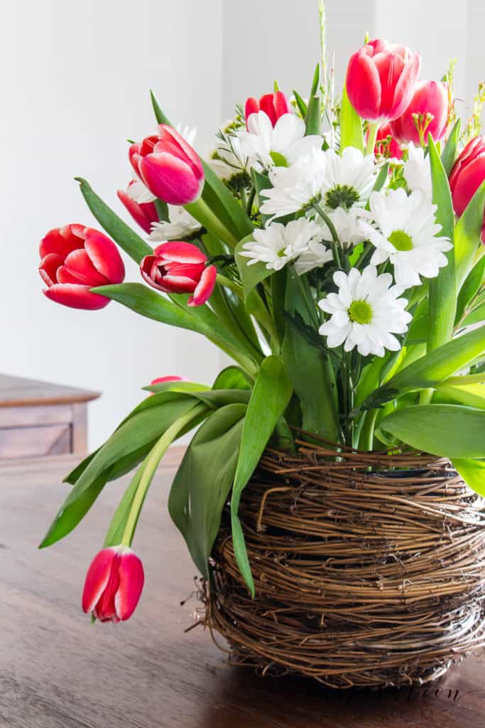 Create a cheerful springtime centerpiece using beautiful tulips for your dining table!
