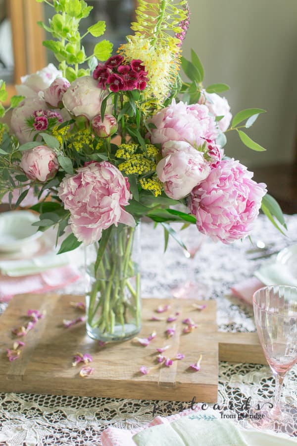 A pink-themed tablescape is the perfect backdrop for some gorgeous peonies! Pink depression glass adds the perfect touch of charm to the whole setup. What a stunning display to welcome spring.