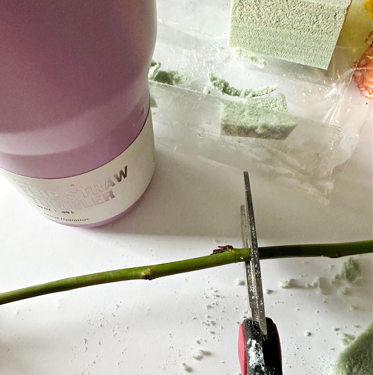 Make the Cut: Cut the stem at a 45-degree angle. For the cup, trim the flowers to fit the height of the cup.