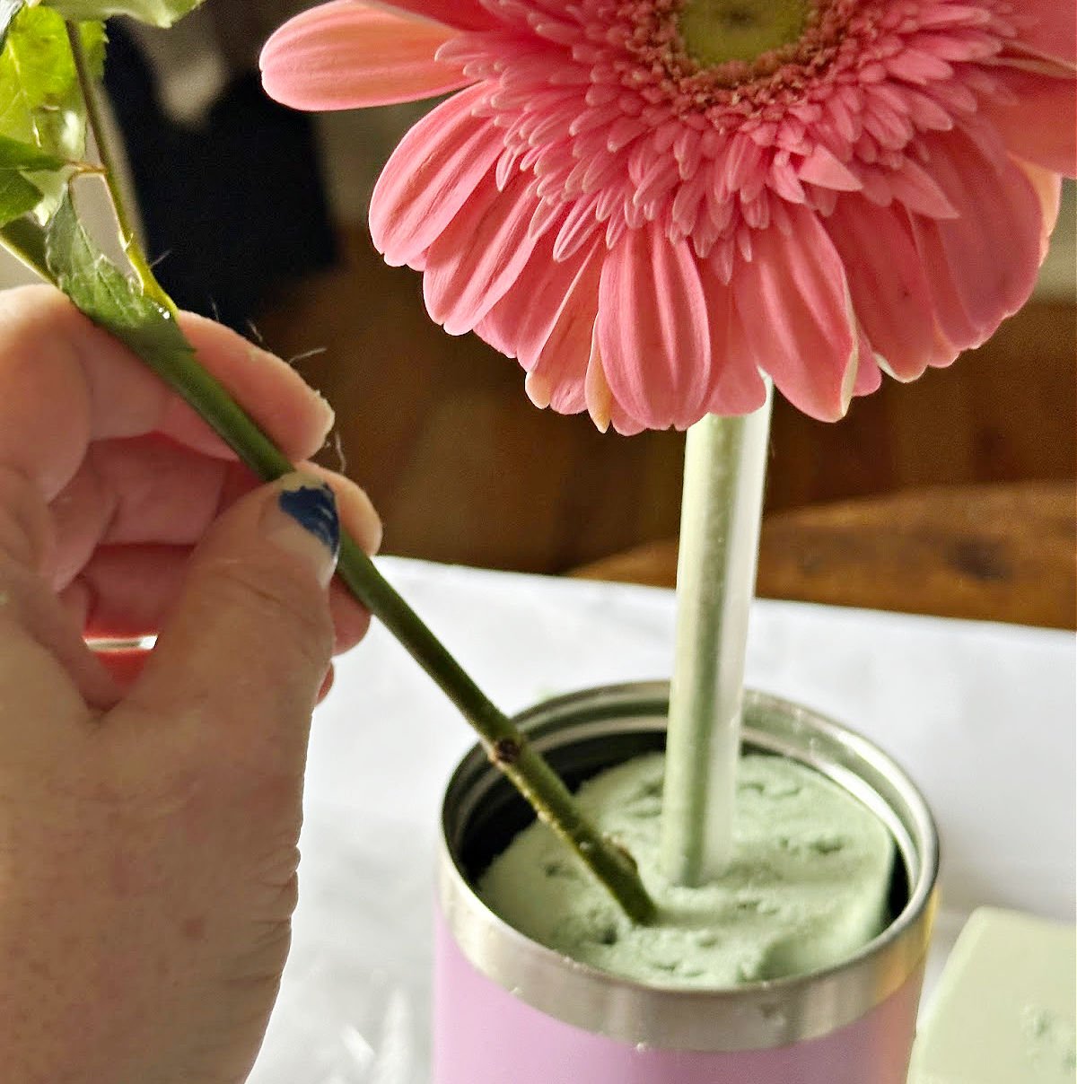 Add the Cup Cover and Straw: To finish off the adorable Stanley cup flower arrangement, I chose to include the cup cover to the bouquet.